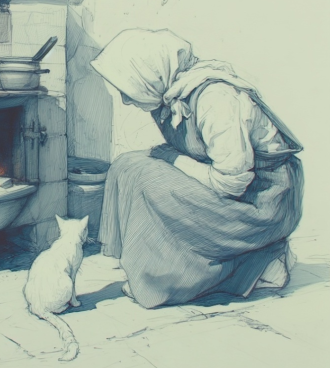 На печке у тётки Анны мягко постелено. Утешает её в одиночестве котёнок — не отходит от неё ни днём ни ночью, и тётка Анна не нарадуется на него. «Согревает меня! Песни поёт. Трону рукой — тёплый, живой, рядышком!» Дочь, которая с ней живёт, одинокая, колхозница — целый день её нет дома. Печь истопит и уходит. А бабка Анна сидит на печке. Глаза плохо видят, и поминает всех, кого за здравие, кого за упокой! Всех перечтёт. Никого не забудет. А то плачет. «Плакать стала, — говорит».