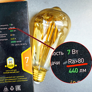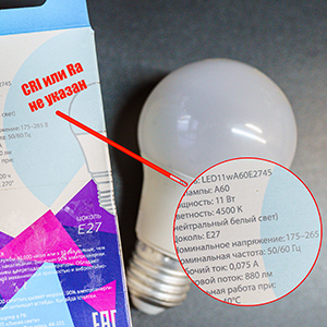 На рисунке 5 мы видим, что на упаковке жёлтой лампочки обозначение Rа больше 80. И у белой лампочки на рисунке 6 тоже обозначено, что Ra больше 80. А вот на упаковке лампочки на рисунке 7 вообще не указано значение индекса цветопередачи. Естественно, возникает вопрос, почему производитель этого не сделал. Скорее всего, CRI (или Ra) данной лампочке меньше 80, и производитель решил об этом умолчать. Но такую лампочку, как уже говорилось, не рекомендуется покупать для использования в жилых помещениях. Для жилых помещений CRI ниже 80 приводит к постоянным искажениям цвета и большему зрительному дискомфорту, особенно это важно для ещё несформировавшегося цветовосприятия у маленьких детей.